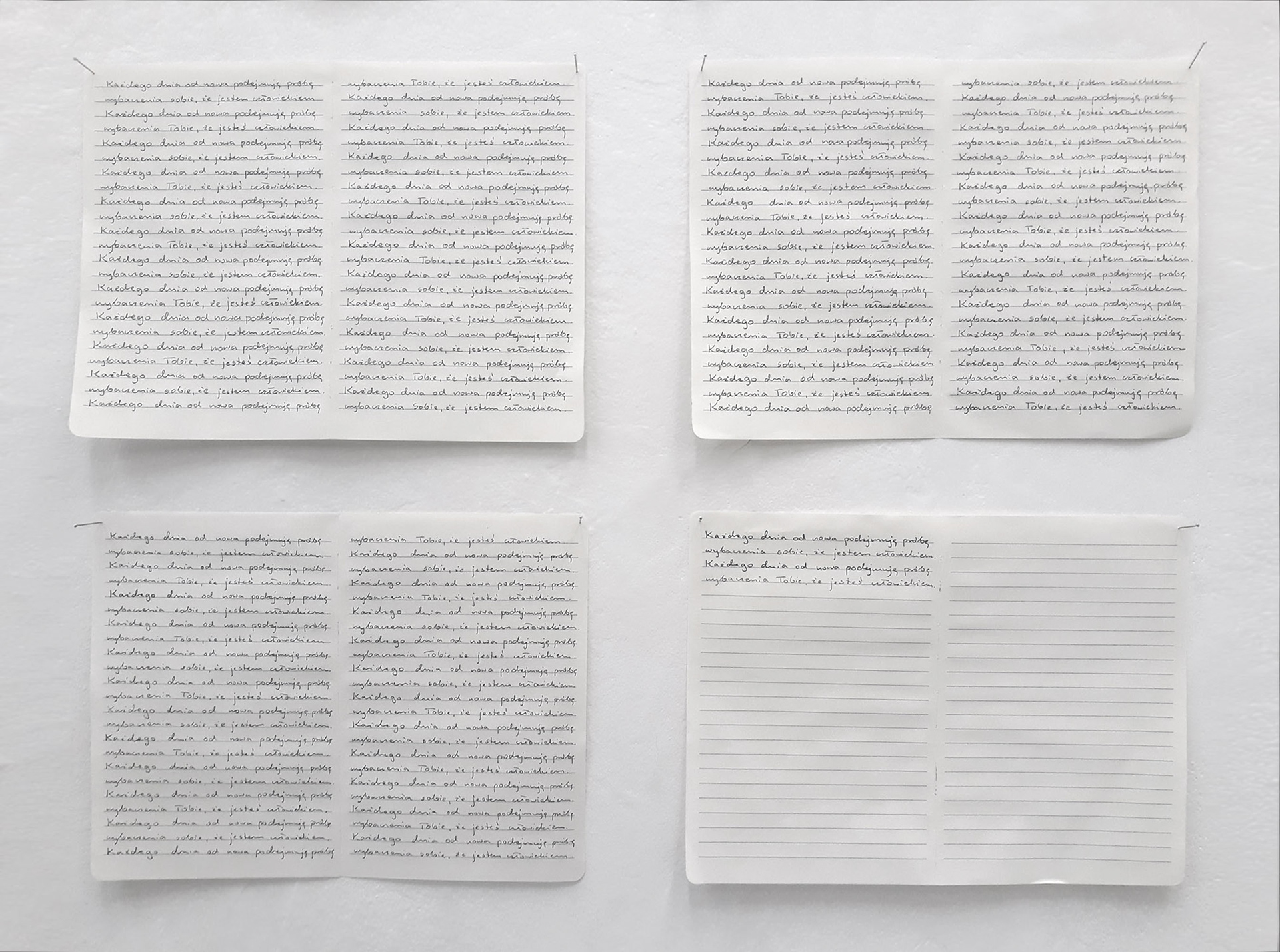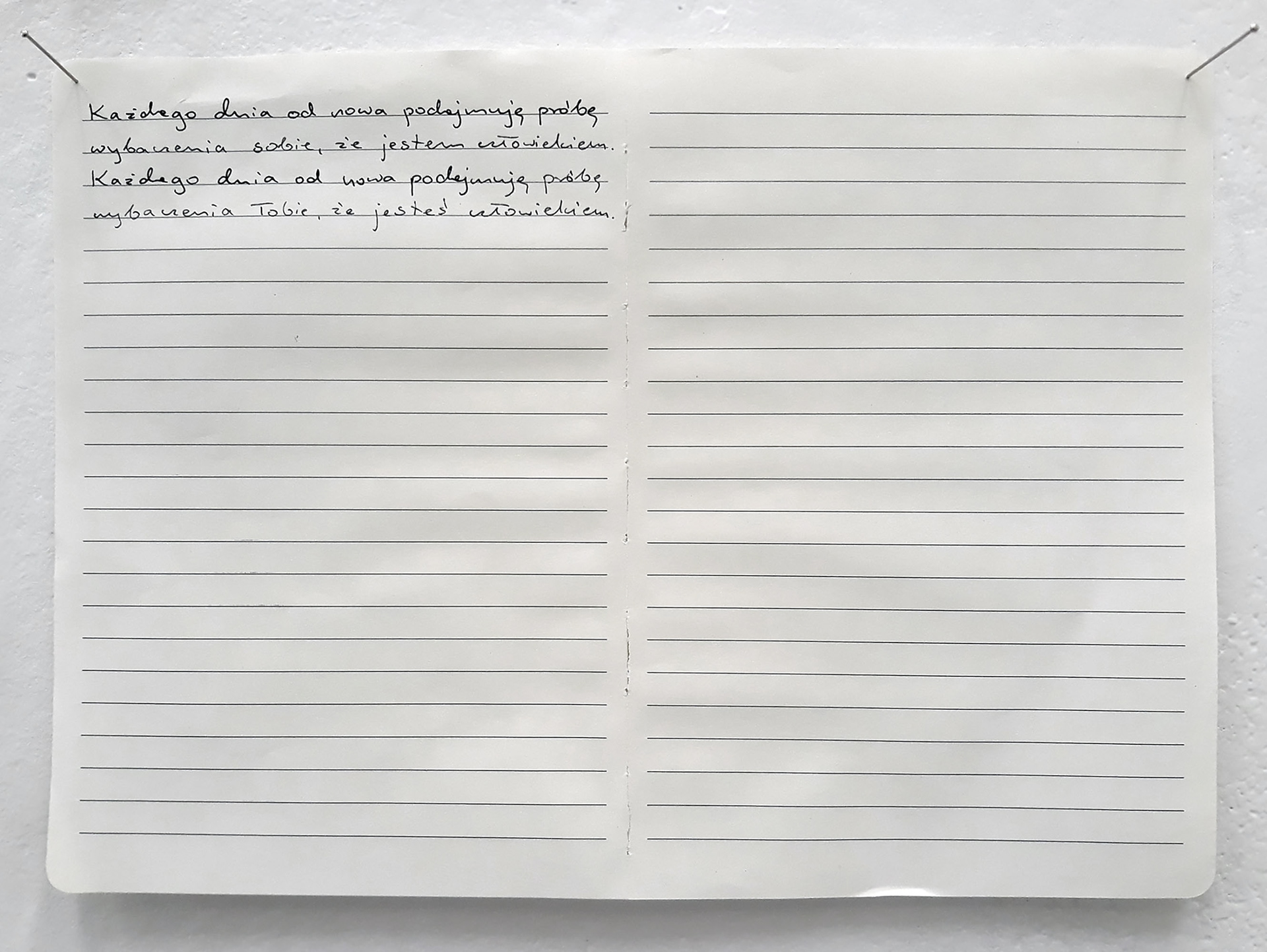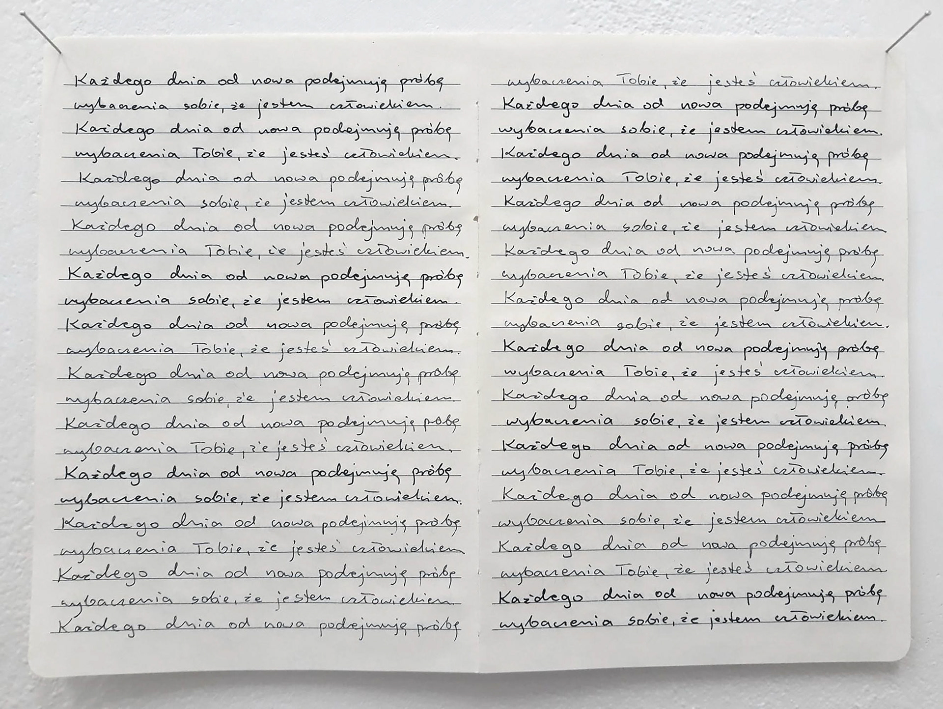 This work is a continuation of the 'Notebooks'. I have stopped writing down information about man's destructive activities towards non-human beings, nature, but I continue to write down my "mantra" – repeating sentences alternately: ”Every day from the beginning I try to forgive myself that I am a human” and ”Every day from the beginning I try to forgive you that you are a human”. To help me to work through this tough knowledge a little bit and regain the balance.