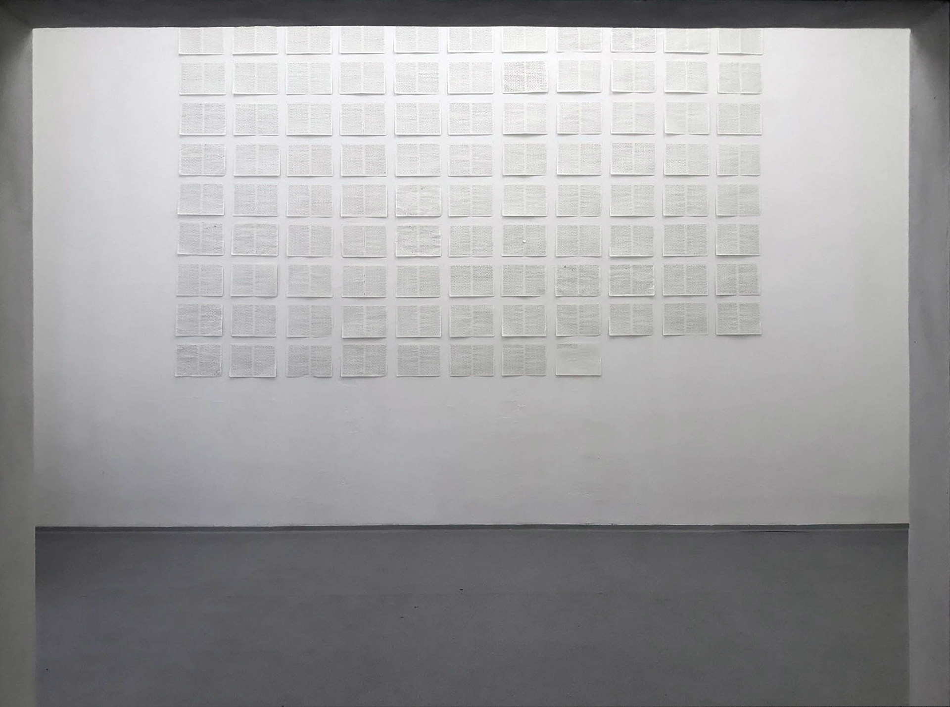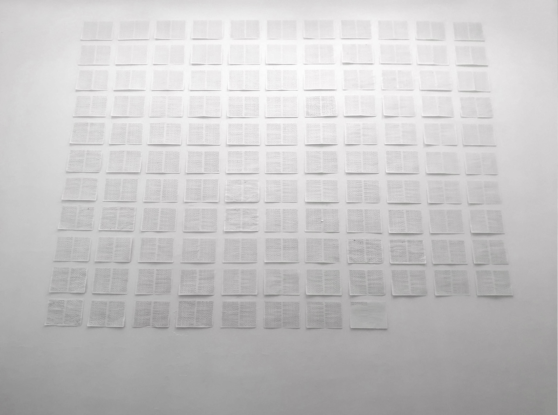 Text installation; sheets of notebook, black ink, whole area 270x370cm. work in progress – its area is constantly expanding.